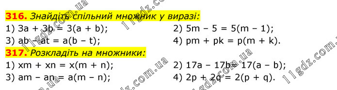 316. Знайдіть спільний множник у виразі: 1) За + 3b = 3(а + b); 3) ab – at = a(b – t); 2) 5m – 5 = 5(m – 1); 4) pm + рk = р(m + k). 317. Розкладіть на множники: 1) хm + хn = х(m + n); 3) am – an = a(m – n); 2) 17а – 17b= 17(а – b); 4) 2p + 2q = 2(р + q).
