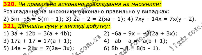320. Чи правильно виконано розкладання на множники: Розкладання на множники виконано правильно у випадках: 2) 5m – 5 = 5(m – 1); 3) 2a – 2 = 2(яa – 1); 4) 7ху – 14х = 7х(у – 2). 321. Запишіть суму у вигляді добутку: 1) 3а + 12b = 3(а + 4b); 3) 17a + 17 = 17(а + 1); 5) 14а – 21х = 7(2а– 3х); 2) –6а – 9х = –3(2а + Зх); 4) –ab – а = –а(b + 1); 6) 8b – 8 = 8(b – 1).