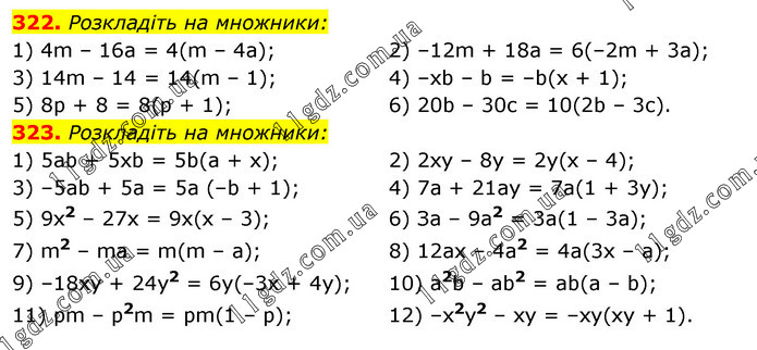 322. Розкладіть на множники: 1) 4m – 16а = 4(m – 4а); 3) 14m – 14 = 14(m – 1); 5) 8р + 8 = 8(р + 1); 2) –12m + 18а = 6(–2m + 3а); 4) –хb – b = –b(х + 1); 6) 20b – 30с = 10(2b – 3с). 323. Розкладіть на множники: 1) 5ab + 5xb = 5b(а + х); 3) –5ab + 5а = 5а (–b + 1); 5) 9х2 – 27х = 9х(х – 3); 7) m2 – mа = m(m – а); 9) –18хy + 24у2 = 6у(–3х + 4у); 11) рm – р2m = рm(1 – р); 2) 2ху – 8у = 2у(х – 4); 4) 7а + 21ау = 7а(1 + 3у); 6) За – 9а2 = 3а(1 – 3а); 8) 12ах – 4а2 = 4а(3х – а); 10) a2b – ab2 = ab(a – b); 12) –х2у2 – ху = –ху(ху + 1).