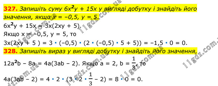 327. Запишіть суму 6х2у + 15х у вигляді добутку і знайдіть його значення, якщо х = –0,5, у = 5. 6х2у + 15x = 3х(2ху + 5). Якщо х = –0,5, у = 5, то 3х(2ху + 5 ) = 3 ∙ (–0,5) ∙ (2 ∙ (–0,5) ∙ 5 + 5)) = –1,5 ∙ 0 = 0. 328. Запишіть вираз у вигляді добутку і знайдіть його значення. 12а2b – 8a = 4a(3ab – 2). Якщо а = 2, b = 1/3, то 4a(3ab – 2) = 4 ∙ 2 ∙ (3 ∙ 2 ∙ 1/3 – 2) = 8 ∙ 0 = 0.