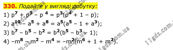 Подайте у вигляді добутку: 1) р7 + р3 – р 4 = р3(р4 + 1 – р); 2) а10 – а5 + a8 = a5(a5 – 1 + а3); 3) b7 – b5 – b2 = b2(b5 – b3 – 1); 4) –m8 – m2 – m4 = –m2(m6 + 1 + m2).