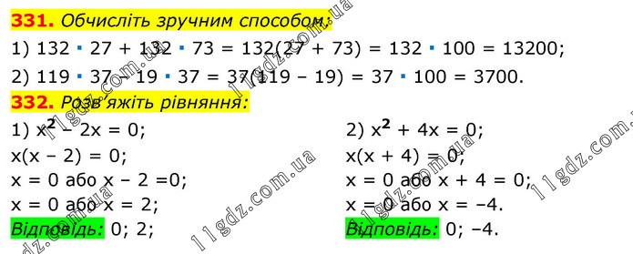 331. Обчисліть зручним способом: 1) 132 ∙ 27 + 132 ∙ 73 = 132(27 + 73) = 132 ∙ 100 = 13200; 2) 119 ∙ 37 – 19 ∙ 37 = 37(119 – 19) = 37 ∙ 100 = 3700. 332. Розв’яжіть рівняння: 1) х2 – 2х = 0; х(х – 2) = 0; х = 0 або х – 2 =0; х = 0 або х = 2; Відповідь: 0; 2; 2) х2 + 4х = 0; х(х + 4) = 0; х = 0 або х + 4 = 0; х = 0 або х = –4. Відповідь: 0; –4.