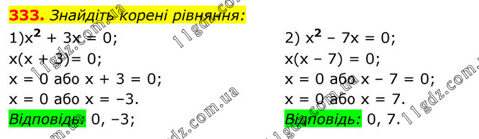 Знайдіть корені рівняння: 1)х2 + 3х = 0; х(х + 3)= 0; х = 0 або х + 3 = 0; х = 0 або х = –3. Відповідь: 0, –3; 2) х2 – 7x = 0; х(х – 7) = 0; х = 0 або х – 7 = 0; х = 0 або х = 7. Відповідь: 0, 7.