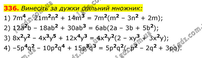 Винесіть за дужки спільний множник: 1) 7m4 – 21m2n2 + 14m3 = 7m2(m2 – 3n2 + 2m); 2) 12a2b – 18ab2 + 30ab3 = 6ab(2a – 3b + 5b2); 3) 8x2y2 – 4х3у5 + 12х4y3 = 4х2у2(2 – ху3 + 3х2у); 4) –5p4q2 – 10p2q4 + 15р3q3 = 5p2q2(–p2 – 2q2 + 3pq).
