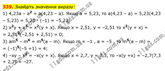 Знайдіть значення виразу: 1) 4,23a – a2 = a(4,23 – а). Якщо a = 5,23, то a(4,23 – a) = 5,23(4,23 – 5,23) = 5,23 ∙ (–1) = –5,23; 2) х2у + x3 = x2(у + х). Якщо х = 2,51, у = –2,51 то х2(у + х) = = 2,512(–2,51 + 2,51) = 0; 3) am5 – m6 = m5(a – m). Якщо m = –1 , а = –5 , то m5(a – m) = = (–1)5(–5 +1) = 4; 4) –ху – x2 = –х(у + х). Якщо х = 2,7, у = 7,3, то –х(у +х) = –2,7(7,3 + 2,7) = –27.
