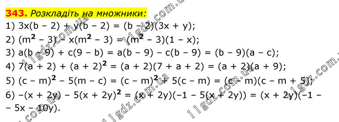 Розкладіть на множники: 1) 3х(b – 2) + у(b – 2) = (b – 2)(3х + у); 2) (m2 – 3) – х(m2 – 3) = (m2 – 3)(1 – х); 3) а(b – 9) + с(9 – b) = а(b – 9) – с(b – 9) = (b – 9)(а – с); 4) 7(а + 2) + (а + 2)2 = (а + 2)(7 + а + 2) = (а + 2)(а + 9); 5) (с – m)2 – 5(m – с) = (с – m)2 + 5(с – m) = (с – m)(с – m + 5); 6) –(х + 2у) – 5(х + 2y)2 = (х + 2у)(–1 – 5(х + 2у)) = (х + 2у)(–1 – – 5х – 10y).