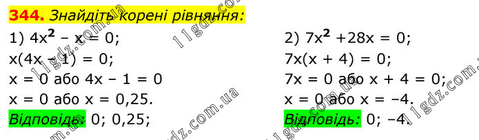 Знайдіть корені рівняння: 1) 4х2 – х = 0; х(4х – 1) = 0; х = 0 або 4х – 1 = 0 х = 0 або х = 0,25. Відповідь: 0; 0,25; 2) 7х2 +28х = 0; 7х(х + 4) = 0; 7х = 0 або х + 4 = 0; х = 0 або х = –4. Відповідь: 0; –4.