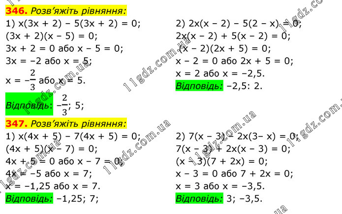 346. Розв’яжіть рівняння: 1) x(3x + 2) – 5(3х + 2) = 0; (3х + 2)(х – 5) = 0; 3х + 2 = 0 або х – 5 = 0; 3х = –2 або х = 5; х = –2/3 або х = 5. Відповідь: –2/3; 5; 2) 2х(х – 2) – 5(2 – х) = 0; 2х(х – 2) + 5(х – 2) = 0; (х – 2)(2х + 5) = 0; х – 2 = 0 або 2х + 5 = 0; х = 2 або х = –2,5. Відповідь: –2,5: 2. 347. Розв’яжіть рівняння: 1) х(4х + 5) – 7(4х + 5) = 0; (4х + 5)(х – 7) = 0; 4х + 5 = 0 або х – 7 = 0; 4х = –5 або х = 7; х = –1,25 або х = 7. Відповідь: –1,25; 7; 2) 7(х – 3) – 2х(3– х) = 0; 7(х – 3) + 2х(х – 3) = 0; (х – 3)(7 + 2х) = 0; х – 3 = 0 або 7 + 2х = 0; х = 3 або х = –3,5. Відповідь: 3; –3,5.