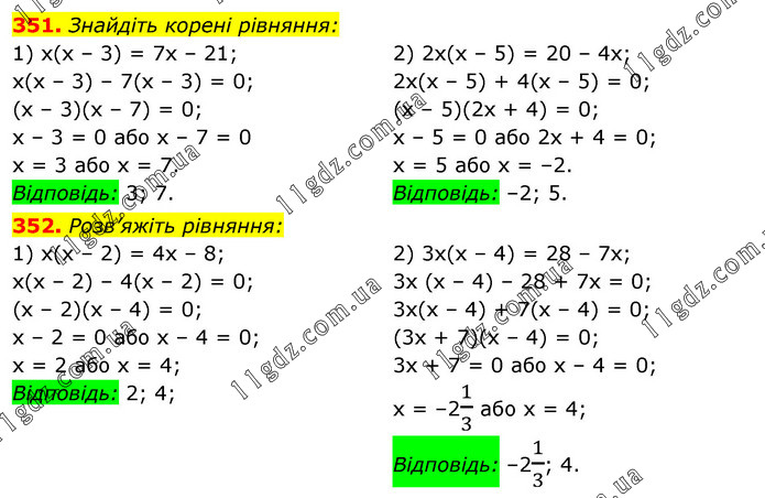 351. Знайдіть корені рівняння: 1) х(х – 3) = 7х – 21; х(х – 3) – 7(х – 3) = 0; (х – 3)(х – 7) = 0; х – 3 = 0 або х – 7 = 0 х = 3 або х = 7. Відповідь: 3; 7. 2) 2х(х – 5) = 20 – 4х; 2х(х – 5) + 4(х – 5) = 0; (х – 5)(2х + 4) = 0; х – 5 = 0 або 2х + 4 = 0; х = 5 або х = –2. Відповідь: –2; 5. 352. Розв’яжіть рівняння: 1) х(х – 2) = 4х – 8; х(х – 2) – 4(х – 2) = 0; (х – 2)(х – 4) = 0; х – 2 = 0 або х – 4 = 0; х = 2 або х = 4; Відповідь: 2; 4; 2) 3х(х – 4) = 28 – 7х; 3х (х – 4) – 28 + 7х = 0; 3х(х – 4) + 7(х – 4) = 0; (3х + 7)(х – 4) = 0; 3х + 7 = 0 або х – 4 = 0; х = –21/3 або х = 4; Відповідь: –21/3; 4.