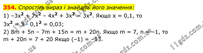 Спростіть вираз і знайдіть його значення: 1) –3х2 + 7x2 – 4x2 + 3х2 = 3х2. Якщо х = 0,1, то 3х2 = 3 ∙ 0,12 = 0,03; 2) 8m + 5n – 7m + 15n = m + 20n. Якщо m = 7, n = –1, то m + 20n = 7 + 20 Якщо (–1) = –13.