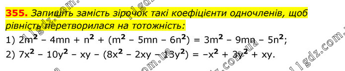 Запишіть замість зірочок такі коефіцієнти одночленів, щоб рівність перетворилася на тотожність: 1) 2m2 – 4mn + n2 + (m2 – 5mn – 6n2) = 3m2 – 9mn – 5n2; 2) 7x2 – 10y2 – ху – (8x2 – 2ху – 13y2) = –x2 + 3у2 + ху.