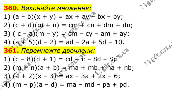 360. Виконайте множення: 1) (а – b)(х + у) = ах + ay – bx – by; 2) (с + d)(m + n) = сm + сn + dm + dn; 3) ( с – а)(m – у) = сm – су – аm + ay; 4) (а + 5)(d – 2) = ad – 2а + 5d – 10. 361. Перемножте двочлени: 1) (с – 8)(d + 1) = cd + с – 8d – 8; 2) (m + n)(а + b) = mа + mb + nа + nb; 3) (а + 2)(х – 3) = ах – 3а + 2х – 6; 4) (m – р)(а – d) = ma – md – ра + pd.