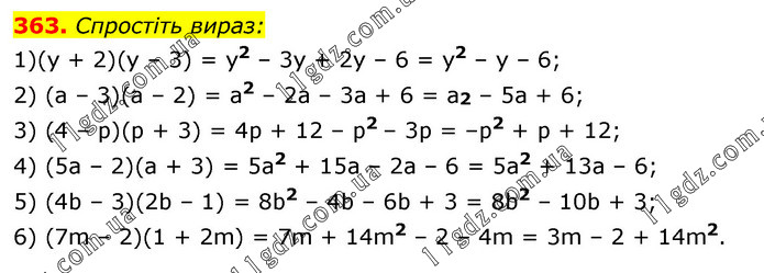 Спростіть вираз: 1)(у + 2)(у – 3) = у2 – 3у + 2у – 6 = у2 – у – 6; 2) (а – 3)(а – 2) = а2 – 2а – 3а + 6 = а2 – 5а + 6; 3) (4 – р)(р + 3) = 4р + 12 – р2 – 3р = –р2 + р + 12; 4) (5а – 2)(а + 3) = 5а2 + 15а – 2а – 6 = 5а2 + 13а – 6; 5) (4b – 3)(2b – 1) = 8b2 – 4b – 6b + 3 = 8b2 – 10b + 3; 6) (7m – 2)(1 + 2m) = 7m + 14m2 – 2 – 4m = 3m – 2 + 14m2.