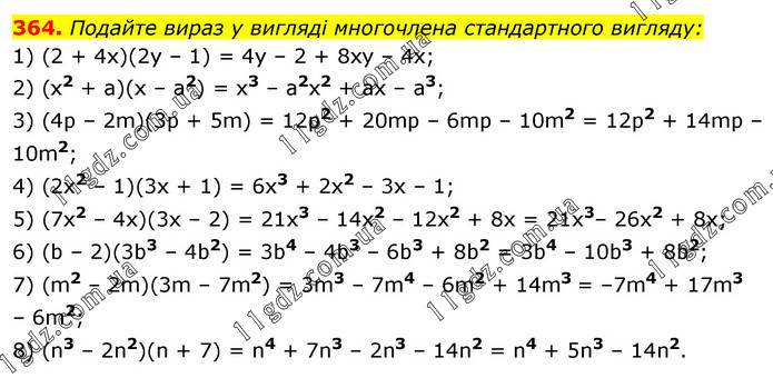 Подайте вираз у вигляді многочлена стандартного вигляду: 1) (2 + 4х)(2у – 1) = 4у – 2 + 8xy – 4х; 2) (х2 + а)(х – a2) = x3 – а2х2 + ах – а3; 3) (4р – 2m)(3р + 5m) = 12p2 + 20mр – 6mр – 10m2 = 12p2 + 14mp – 10m2; 4) (2х2 – 1)(3х + 1) = 6х3 + 2x2 – 3х – 1; 5) (7х2 – 4х)(3х – 2) = 21х3 – 14х2 – 12х2 + 8х = 21х3– 26х2 + 8x; 6) (b – 2)(3b3 – 4b2) = 3b4 – 4b3 – 6b3 + 8b2 = 3b4 – 10b3 + 8b2; 7) (m2 – 2m)(3m – 7m2) = 3m3 – 7m4 – 6m2 + 14m3 = –7m4 + 17m3 – 6m2; 8) (n3 – 2n2)(n + 7) = n4 + 7n3 – 2n3 – 14n2 = n4 + 5n3 – 14n2.
