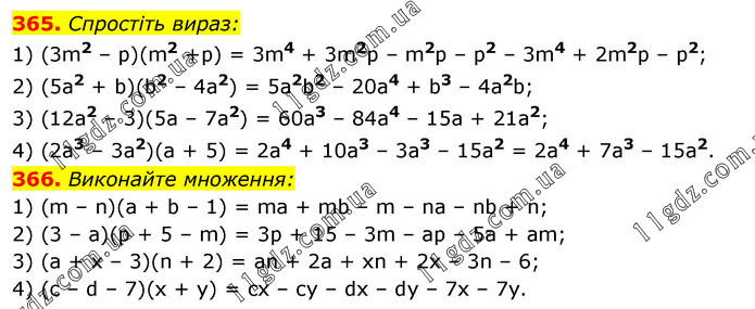 365. Спростіть вираз: 1) (3m2 – р)(m2 +р) = 3m4 + 3m2р – m2р – р2 – 3m4 + 2m2р – р2; 2) (5а2 + b)(b2 – 4а2) = 5a2b2 – 20а4 + b3 – 4a2b; 3) (12а2 – 3)(5а – 7a2) = 60а3 – 84а4 – 15а + 21а2; 4) (2а3 – 3а2)(а + 5) = 2а4 + 10а3 – 3а3 – 15а2 = 2а4 + 7а3 – 15а2. 366. Виконайте множення: 1) (m – n)(а + b – 1) = mа + mb – m – nа – nb + n; 2) (3 – а)(р + 5 – m) = 3р + 15 – 3m – ар – 5a + am; 3) (а + х – 3)(n + 2) = an + 2а + хn + 2х – 3n – 6; 4) (c – d – 7)(х + у) = cx – су – dx – dy – 7x – 7y.