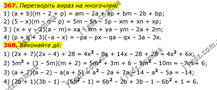 367. Перетворіть вираз на многочлен: 1) (а + b)(m – 2 + р) = am – 2а + ар + bm – 2b + bр; 2) (5 – х)(m – n – р) = 5m – 5n – 5р – хm + хn + хр; З ) (х + у – 2)(а – m)= ха – хm + уа – уm – 2а + 2m; 4) (р + q + 3)(–а – х) = –ра – рх – qa – qx – 3а – 3х. 368. Виконайте дії: 1) (2x + 7)(2х – 4) + 28 = 4x2 – 8x + 14x – 28 + 28 = 4x2 + 6x; 2) 5m2 + (3 – 5m)(m + 2) = 5m2 + 3m + 6 – 5m2 – 10m = –7m + 6; 3) (а + 7)(а – 2) – а(а + 5) = а2 – 2а + 7a – 14 – а2 – 5а = –14; 4) (2b + 1)(3b – 1) – (6b2 – 1) = 6b2 – 2b + 3b – 1 – 6b2 + 1 = 6.