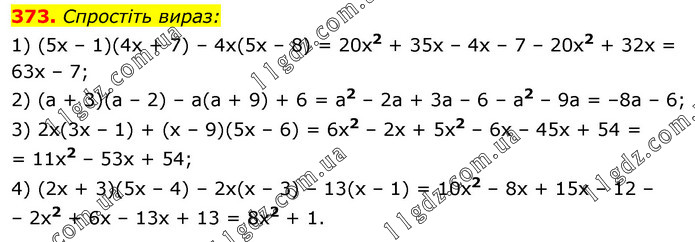 Спростіть вираз: 1) (5x – 1)(4х + 7) – 4x(5x – 8) = 20x2 + 35x – 4x – 7 – 20x2 + 32x = 63x – 7; 2) (а + 3)(а – 2) – а(а + 9) + 6 = а2 – 2а + 3а – 6 – а2 – 9а = –8а – 6; 3) 2x(3x – 1) + (х – 9)(5x – 6) = 6х2 – 2x + 5x2 – 6x – 45x + 54 = = 11x2 – 53x + 54; 4) (2х + 3)(5х – 4) – 2x(x – 3) – 13(х – 1) = 10x2 – 8x + 15x – 12 – – 2x2 + 6х – 13x + 13 = 8x2 + 1.