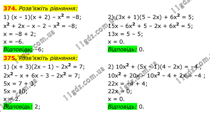 374. Розв’яжіть рівняння: 1) (x – 1)(x + 2) – x2 = –8; x2 + 2x – x – 2 – х2 = –8; x = –8 + 2; x = –6. Відповідь: –6; 2) (3х + 1)(5 – 2x) + 6x2 = 5; 15x – 6x2 + 5 – 2x + 6x2 = 5; 13x = 5 – 5; х = 0. Відповідь: 0. 375. Розв’яжіть рівняння: 1) (х + 3)(2х – 1) – 2x2 = 7; 2x2 – x + 6х – 3 – 2х2 = 7; 5x = 7 + 3; 5x = 10; x = 2. Відповідь: 2; 2) 10x2 + (5x – 1)(4 – 2x) = –4 ; 10x2 + 20x – 10x2 – 4 + 2х = –4 ; 22x = –4 + 4; 22x = 0; x = 0. Відповідь: 0.
