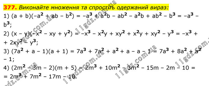 Виконайте множення та спростіть одержаний вираз: 1) (а + b)(–а2 + аb – b2) = –а3 + а2b – аb2 – а2b + ab2 – b3 = –а3 – b3; 2) (x – у)(–x2 – xу + у2) = –x3 – x2у + ху2 + x2у + xу2 – у3 = –x3 + + 2xу2 – у3; 3) (7а2 + а – 1)(а + 1) = 7а3 + 7а2 + а2 + а – а – 1 = 7а3 + 8а2 + а2 – 1; 4) (2m2 – 3m – 2)(m + 5) = 2m3 + 10m2 – 3m2 – 15m – 2m – 10 = = 2m3 + 7m2 – 17m – 10.