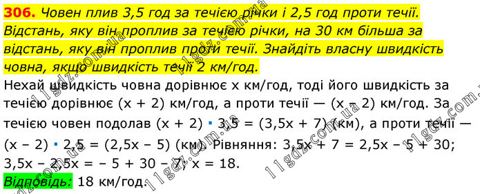 Човен плив 3,5 год за течією річки і 2,5 год проти течії. Відстань, яку він проплив за течією річки, на 30 км більша за відстань, яку він проплив проти течії. Знайдіть власну швидкість човна, якщо швидкість течії 2 км/год. Нехай швидкість човна дорівнює х км/год, тоді його швидкість за течією дорівнює (х + 2) км/год, а проти течії — (х – 2) км/год. За течією човен подолав (х + 2) ∙ 3,5 = (3,5х + 7) (км), а проти течії — (х – 2) ∙ 2,5 = (2,5х – 5) (км). Рівняння: 3,5х + 7 = 2,5х – 5 + 30; 3,5х – 2,5х = – 5 + 30 – 7; х = 18. Відповідь: 18 км/год.