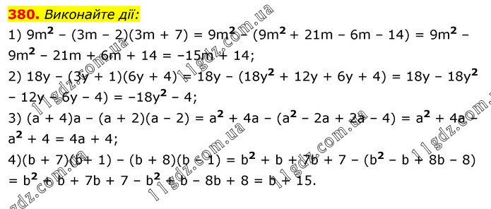 Виконайте дії: 1) 9m2 – (3m – 2)(3m + 7) = 9m2 – (9m2 + 21m – 6m – 14) = 9m2 – 9m2 – 21m + 6m + 14 = –15m + 14; 2) 18y – (3y + 1)(6у + 4) = 18у – (18у2 + 12у + 6у + 4) = 18у – 18у2 – 12у – 6у – 4) = –18y2 – 4; 3) (а + 4)а – (а + 2)(а – 2) = а2 + 4а – (а2 – 2а + 2а – 4) = а2 + 4а – а2 + 4 = 4а + 4; 4)(b + 7)(b+ 1) – (b + 8)(b – 1) = b2 + b + 7b + 7 – (b2 – b + 8b – 8) = b2 + b + 7b + 7 – b2 + b – 8b + 8 = b + 15.