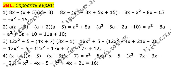 Спростіть вираз: 1) 8х – (х + 5)(х + 3) = 8х – (х2 + 3х + 5х + 15) = 8х – x2 – 8х – 15 = –x2 – 15; 2) а(а + 8) – (а + 2)(а – 5) = а2 + 8а – (а2 – 5а + 2а – 10) = а2 + 8а – а2 + 3а + 10 = 11а + 10; 3) 12x2 + 5 – (4х + 7) (3х – 1) =12х2 + 5 – (12х2 – 4х + 21х – 7) = = 12x2 + 5 – 12х2 – 17х + 7 = –17х + 12; 4) (х + 1)(х – 5) – (х + 3)(х – 7) = x2 – 5х + х – 5 – (х2 – 7х + 3х – – 21) = x2 – 4х – 5 – х2 + 4х + 21 = 16.