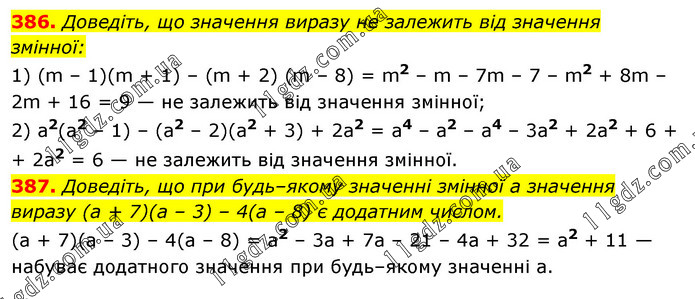 Доведіть, що значення виразу не залежить від значення змінної: 1) (m – 1)(m + 1) – (m + 2) (m – 8) = m2 – m – 7m – 7 – m2 + 8m – 2m + 16 = 9 — не залежить від значення змінної; 2) a2(a2 – 1) – (а2 – 2)(а2 + 3) + 2а2 = а4 – а2 – а4 – 3а2 + 2а2 + 6 + + 2а2 = 6 — не залежить від значення змінної. 387. Доведіть, що при будь–якому значенні змінної а значення виразу (а + 7)(а – 3) – 4(а – 8) є додатним числом. (а + 7)(а – 3) – 4(а – 8) = а2 – 3а + 7а – 21 – 4а + 32 = а2 + 11 — набуває додатного значення при будь–якому значенні а.