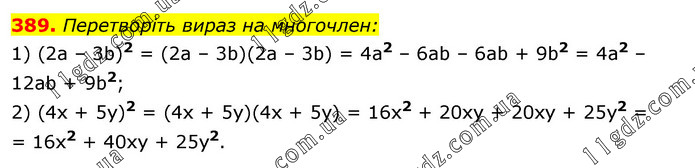 Перетворіть вираз на многочлен: 1) (2а – 3b)2 = (2а – 3b)(2а – 3b) = 4а2 – 6аb – 6аb + 9b2 = 4a2 – 12аb + 9b2; 2) (4х + 5у)2 = (4х + 5у)(4х + 5у) = 16х2 + 20ху + 20ху + 25y2 = = 16х2 + 40ху + 25y2.