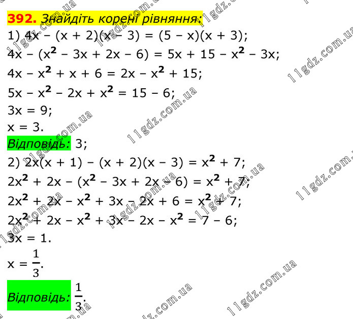 Знайдіть корені рівняння: 1) 4х – (х + 2)(х – 3) = (5 – х)(х + 3); 4х – (х2 – 3х + 2х – 6) = 5х + 15 – х2 – 3х; 4х – х2 + х + 6 = 2х – х2 + 15; 5х – x2 – 2х + x2 = 15 – 6; 3х = 9; х = 3. Відповідь: 3; 2) 2х(х + 1) – (х + 2)(х – 3) = х2 + 7; 2x2 + 2х – (х2 – 3х + 2х – 6) = x2 + 7; 2х2 + 2х – х2 + 3х – 2х + 6 = х2 + 7; 2х2 + 2х – х2 + 3х – 2х – х2 = 7 – 6; 3х = 1. х = 1/3. Відповідь: 1/3.
