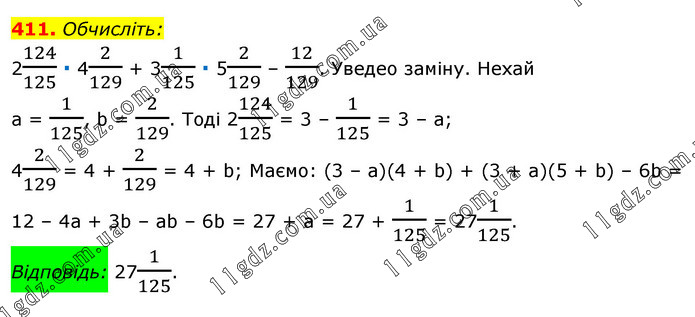 Обчисліть: 2124/125 ∙ 42/129 + 31/125 ∙ 52/129 – 12/129. Уведео заміну. Нехай a = 1/125, b = 2/129. Тоді 2124/125 = 3 – 1/125 = 3 – a; 42/129 = 4 + 2/129 = 4 + b; Маємо: (3 – a)(4 + b) + (3 + a)(5 + b) – 6b = 12 – 4a + 3b – ab – 6b = 27 + a = 27 + 1/125 = 271/125. Відповідь: 271/125.