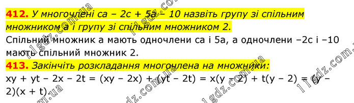 412. У многочлені са – 2с + 5а – 10 назвіть групу зі спільним множником а і групу зі спільним множником 2. Спільний множник а мають одночлени са і 5а, а одночлени –2с і –10 мають спільний множник 2. 413. Закінчіть розкладання многочлена на множники: xy + yt – 2x – 2t = (xy – 2x) + (yt – 2t) = х(у – 2) + t(y – 2) = (у – 2)(х + t).