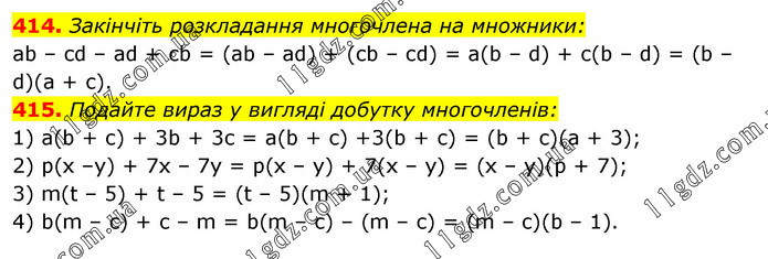 414. Закінчіть розкладання многочлена на множники: ab – cd – ad + cb = (ab – ad) + (cb – cd) = a(b – d) + c(b – d) = (b – d)(a + c). 415. Подайте вираз у вигляді добутку многочленів: 1) a(b + c) + 3b + 3c = a(b + c) +3(b + c) = (b + c)(a + 3); 2) p(x –y) + 7x – 7y = p(x – y) + 7(x – y) = (x – y)(p + 7); 3) m(t – 5) + t – 5 = (t – 5)(m + 1); 4) b(m – c) + c – m = b(m – c) – (m – c) = (m – c)(b – 1).