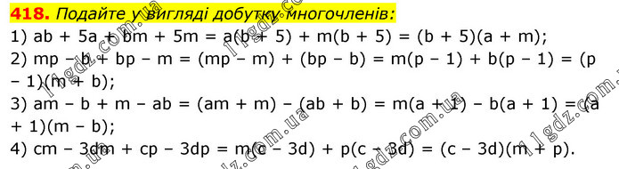 Подайте у вигляді добутку многочленів: 1) ab + 5a + bm + 5m = a(b + 5) + m(b + 5) = (b + 5)(a + m); 2) mp – b + bp – m = (mp – m) + (bp – b) = m(р – 1) + b(p – 1) = (p – 1)(m + b); 3) am – b + m – ab = (am + m) – (ab + b) = m(а + 1) – b(a + 1) = (a + 1)(m – b); 4) cm – 3dm + cp – 3dp = m(c – 3d) + p(c – 3d) = (c – 3d)(m + p).