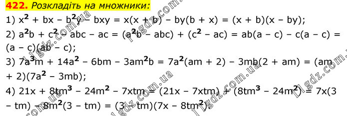 Розкладіть на множники: 1) x2 + bx – b2y – bxy = x(x + b) – by(b + x) = (x + b)(x – by); 2) a2b + c2 – abc – ac = (a2b – abc) + (c2 – ac) = ab(a – c) – c(a – c) = (a – c)(ab – c); 3) 7a3m + 14a2 – 6bm – 3am2b = 7a2(am + 2) – 3mb(2 + am) = (am + 2)(7a2 – 3mb); 4) 21x + 8tm3 – 24m2 – 7xtm = (21x – 7xtm) + (8tm3 – 24m2) = 7x(3 – tm) – 8m2(3 – tm) = (3 – tm)(7x – 8tm2).