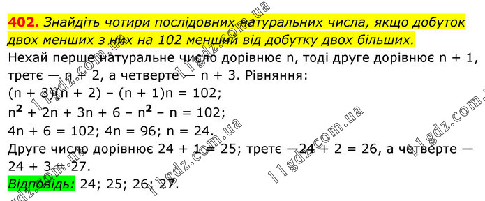 Знайдіть чотири послідовних натуральних числа, якщо добуток двох менших з них на 102 менший від добутку двох більших. Нехай перше натуральне число дорівнює n, тоді друге дорівнює n + 1, третє — n + 2, а четверте — n + 3. Рівняння: (n + 3)(n + 2) – (n + 1)n = 102; n2 + 2n + 3n + 6 – n2 – n = 102; 4n + 6 = 102; 4n = 96; n = 24. Друге число дорівнює 24 + 1 = 25; третє —24 + 2 = 26, а четверте — 24 + 3 = 27. Відповідь: 24; 25; 26; 27.