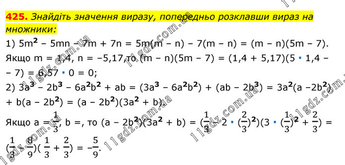 Знайдіть значення виразу, попередньо розклавши вираз на множники: 1) 5m2 – 5mn – 7m + 7n = 5m(m – n) – 7(m – n) = (m – n)(5m – 7). Якщо m = 1,4, n = –5,17,то (m – n)(5m – 7) = (1,4 + 5,17)(5 ∙ 1,4 – – 7) = 6,57 ∙ 0 = 0; 2) 3a3 – 2b3 – 6a2b2 + ab = (3а3 – 6a2b2) + (ab – 2b3) = 3a2(a –2b2) + b(a – 2b2) = (a – 2b2)(3a2 + b). Якщо a = 1/3, b =, тo (a – 2b2)(3a2 + b) = (1/3 – 2 ∙ (2/3)2)(3 ∙ (1/3)2 + 2/3) = (1/3 – 8/9)( 1/3 + 2/3) = –5/9.