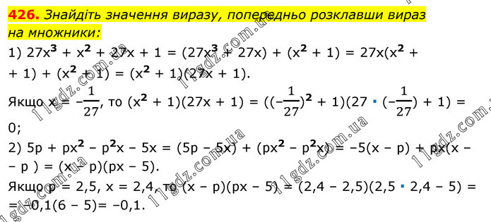 Знайдіть значення виразу, попередньо розклавши вираз на множники: 1) 27x3 + x2 + 27x + 1 = (27x3 + 27x) + (x2 + 1) = 27x(x2 + + 1) + (x2 + 1) = (x2 + 1)(27x + 1). Якщо x = –1/27, то (x2 + 1)(27x + 1) = ((–1/27)2 + 1)(27 ∙ (–1/27) + 1) = 0; 2) 5p + px2 – p2x – 5x = (5p – 5x) + (px2 – p2x) = –5(x – p) + px(x – – p ) = (x – p)(px – 5). Якщо p = 2,5, x = 2,4, то (x – p)(px – 5) = (2,4 – 2,5)(2,5 ∙ 2,4 – 5) = = –0,1(6 – 5)= –0,1.