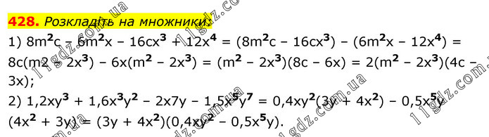 Розкладіть на множники: 1) 8m2c – 6m2x – 16cx3 + 12x4 = (8m2c – 16cx3) – (6m2x – 12x4) = 8c(m2 – 2x3) – 6x(m2 – 2x3) = (m2 – 2x3)(8c – 6x) = 2(m2 – 2x3)(4c – 3x); 2) 1,2xy3 + 1,6x3y2 – 2x7у – 1,5x5y7 = 0,4xy2(3y + 4x2) – 0,5x5y (4x2 + 3y) = (3у + 4x2)(0,4xy2 – 0,5x5y).