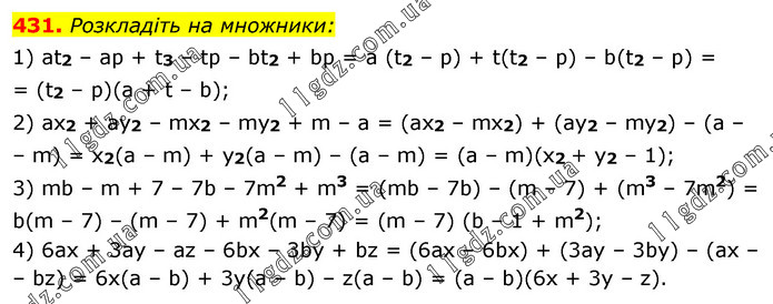 Розкладіть на множники: 1) at2 – ар + t3 – tp – bt2 + bp = а (t2 – р) + t(t2 – р) – b(t2 – р) = = (t2 – р)(а + t – b); 2) ах2 + aу2 – mх2 – mу2 + m – а = (ах2 – mх2) + (ау2 – mу2) – (а – – m) = х2(a – m) + у2(a – m) – (a – m) = (а – m)(х2 + у2 – 1); 3) mb – m + 7 – 7b – 7m2 + m3 = (mb – 7b) – (m – 7) + (m3 – 7m2) = b(m – 7) – (m – 7) + m2(m – 7) = (m – 7) (b – 1 + m2); 4) 6ах + 3ay – az – 6bх – 3bу + bz = (6ах – 6bх) + (3aу – 3bу) – (аx – – bz) = 6х(a – b) + 3у(a – b) – z(a – b) = (а – b)(6х + 3у – z).
