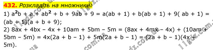 Розкладіть на множники: 1) a2b + a + ab2 + b + 9ab + 9 = a(ab + 1) + b(ab + 1) + 9( аb + 1) = (ab + 1)(a + b + 9); 2) 8ах + 4bх – 4х + 10аm + 5bm – 5m = (8ах + 4mх – 4х) + (10am + 5bm – 5m) = 4х(2a + b – 1) + 5m(2а + b – 1) = (2a + b – 1)(4х + 5m).