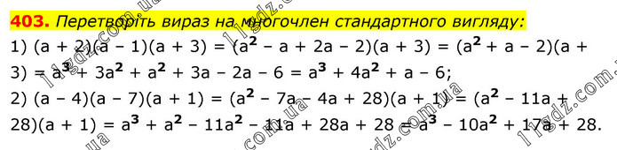 Перетворіть вираз на многочлен стандартного вигляду: 1) (а + 2)(а – 1)(а + 3) = (а2 – а + 2а – 2)(а + 3) = (а2 + а – 2)(а + 3) = а3 + 3а2 + а2 + 3а – 2а – 6 = а3 + 4а2 + а – 6; 2) (а – 4)(а – 7)(а + 1) = (а2 – 7а – 4а + 28)(а + 1) = (а2 – 11а + 28)(а + 1) = а3 + а2 – 11a2 – 11а + 28а + 28 = а3 – 10a2 + 17а + 28.