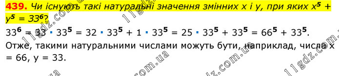 Чи існують такі натуральні значення змінних x і у, при яких x5 + у5 = ЗЗ6? 336 = 33 ∙ 335 = 32 ∙ 335 + 1 ∙ 335 = 25 ∙ 335 + 335 = 665 + 335. Отже, такими натуральними числами можуть бути, наприклад, числа х = 66, у = 33.