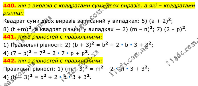 440. Які з виразів є квадратами суми двох виразів, а які – квадратами різниці: Квадрат суми двох виразів записаний у випадках: 5) (а + 2)2; 8) (t +m)2, а квадрат різниці у випадках — 2) (m – n)2; 7) (2 – р)2. 441. Які з рівностей є правильними: 1) Правильні рівності: 2) (b + 3)2 = b2 + 2 ∙ b ∙ 3 + 32; 4) (7 – р)2 = 72 – 2 ∙ 7 ∙ р + р2. 442. Які з рівностей є правильними: Правильні рівності: 1) (m – 3)2 = m2 – 2 ∙ m ∙ 3 + 32; 4) (b + 3)2 = b2 + 2 ∙ b ∙ 3 + 32.