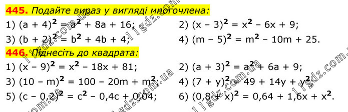 445. Подайте вираз у вигляді многочлена: 1) (а + 4)2 = а2 + 8а + 16; 3) (b + 2)2 = b2 + 4b + 4; 2) (х – 3)2 = x2 – 6х + 9; 4) (m – 5)2 = m2 – 10m + 25. 446. Піднесіть до квадрата: 1) (x – 9)2 = x2 – 18х + 81; 3) (10 – m)2 = 100 – 20m + m2; 5) (с – 0,2)2 = c2 – 0,4с + 0,04; 2) (а + 3)2 = а2 + 6а + 9; 4) (7 + у)2 = 49 + 14у + y2; 6) (0,8 + х)2 = 0,64 + 1,6х + х2.
