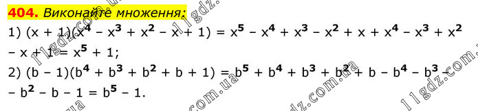 Виконайте множення: 1) (х + 1)(х4 – x3 + x2 – х + 1) = х5 – x4 + х3 – x2 + х + х4 – x3 + x2 – х + 1 = х5 + 1; 2) (b – 1)(b4 + b3 + b2 + b + 1) = b5 + b4 + b3 + b2 + b – b4 – b3 – – b2 – b – 1 = b5 – 1.
