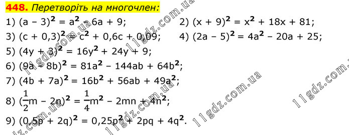 Перетворіть на многочлен: 1) (а – 3)2 = а2 – 6а + 9; 3) (с + 0,3)2 = с2 + 0,6с + 0,09; 5) (4у + 3)2 = 16у2 + 24у + 9; 2) (х + 9)2 = х2 + 18х + 81; 4) (2а – 5)2 = 4а2 – 20а + 25; 6) (9а – 8b)2 = 81а2 – 144ab + 64b2; 7) (4b + 7а)2 = 16b2 + 56ab + 49а2; 8) (1/2m – 2n)2 = 1/4m2 – 2mn + 4n2; 9) (0,5p + 2q)2 = 0,25p2 + 2pq + 4q2.