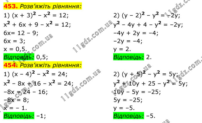 453. Розв’яжіть рівняння: 1) (х + 3)2 – x2 = 12; x2 + 6x + 9 – x2 = 12; 6х= 12 – 9; 6х = 3; х = 0,5. Відповідь: 0,5; 2) (у – 2)2 – у2 = –2у; y2 – 4у + 4 – у2 = –2у; –4у + 2у = –4; –2у = –4; у = 2. Відповідь: 2. 454. Розв’яжіть рівняння: 1) (х – 4)2 – x2 = 24; x2 – 8х + 16 – х2 = 24; –8х = 24 – 16; –8х = 8; х = – 1. Відповідь: –1; 2) (у + 5)2 – у2 = 5у; у2 + 10y + 25 – у2 = 5у; 10y – 5у = –25; 5у = –25; у = –5. Відповідь: –5.