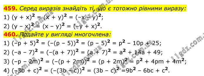 459. Серед виразів знайдіть ті, що є тотожно рівними виразу: 1) (у + х)2 = (x + у)2 = (–х – у)2; 2) (у – х)2 = (х – у)2 = (–у + х)2. 460. Подайте у вигляді многочлена: 1) (–р + 5)2 = (–(p – 5))2 = (р – 5)2 = р2 – 10p + 25; 2) (–а – 7)2 = (–(а + 7))2 = (а + 7)2 = a2 + 14а + 49; 3) (–р – 2m)2 = (–(р + 2m))2 = (р + 2m)2 = р2 + 4рm + 4m2; 4) (–3b + с)2 = (–(3b – с))2 = (3b – с)2 =9b2 – 6bc + с2.