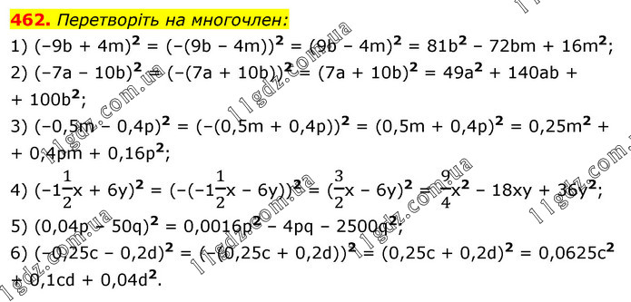 Перетворіть на многочлен: 1) (–9b + 4m)2 = (–(9b – 4m))2 = (9b – 4m)2 = 81b2 – 72bm + 16m2; 2) (–7а – 10b)2 = (–(7а + 10b))2 = (7а + 10b)2 = 49а2 + 140аb + + 100b2; 3) (–0,5m – 0,4р)2 = (–(0,5m + 0,4р))2 = (0,5m + 0,4р)2 = 0,25m2 + + 0,4рm + 0,16р2; 4) (–11/2x + 6y)2 = (–(–11/2x – 6y))2 = (3/2x – 6y)2 = 9/4x2 – 18xy + 36y2; 5) (0,04р – 50q)2 = 0,0016р2 – 4рq – 2500q2; 6) (–0,25с – 0,2d)2 = (–(0,25с + 0,2d))2 = (0,25с + 0,2d)2 = 0,0625с2 + 0,1сd + 0,04d2.