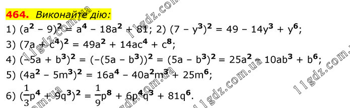 Виконайте дію: 1) (а2 – 9)2 = а4 – 18а2 + 81; 2) (7 – у3)2 = 49 – 14у3 + y6; 3) (7а + с4)2 = 49а2 + 14ас4 + с8; 4) (–5а + b3)2 = (–(5а – b3))2 = (5а – b3)2 = 25а2 – 10аb3 + b6; 5) (4а2 – 5m3)2 = 16а4 – 40a2m3 + 25m6; 6) (1/3р4 + 9q3)2 = 1/9p8 + 6p4q3 + 81q6.